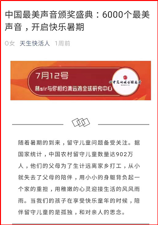 H5线上录音间选择其中一个留守儿童讲述他*喜欢的故事,形成双向互动,刺激社交分享;在线下,举办了多场推广活动,以“为爱发声墙”等互动物料形式为线上引流。*终H5 PV达24万,录得6220个故事作品;在颁奖期,连续第三年打造中国**声音公益盛事——中国*美声音颁奖盛典,得到了全国媒体的广泛关注!