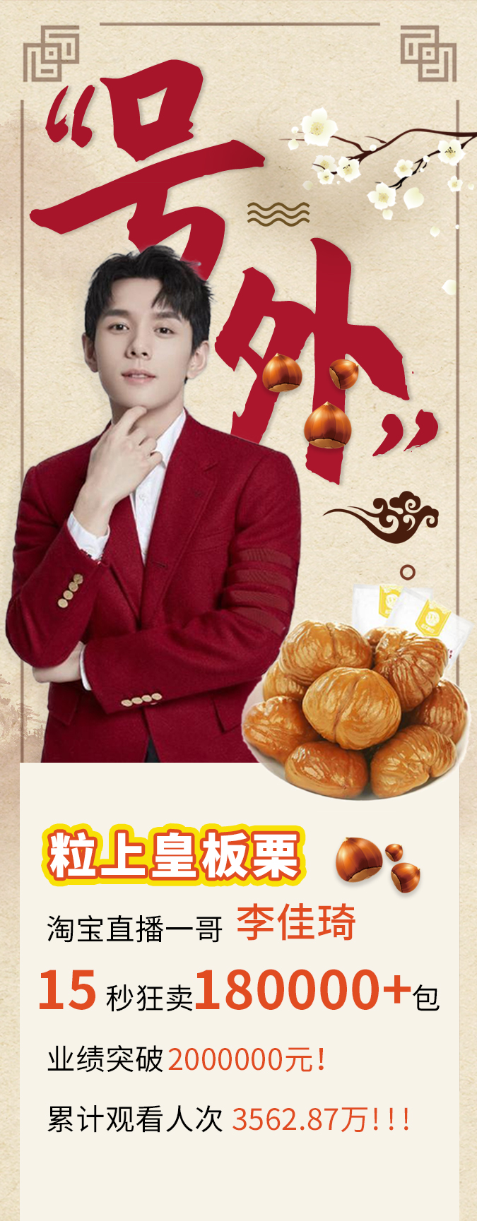 “板栗中的爱马仕 李佳琦”“15秒抢光18万包粒上皇板栗”轰炸全网,100多家网络1.0网站纷纷转载发酵。以“李佳琦板栗”为关键词搜索的相关资讯约1999000个。关键词为“15秒抢光18万包粒上皇板栗”相关报道高达31,972条。关键词为“板栗中的爱马仕 李佳琦”相关报道高达14700条。